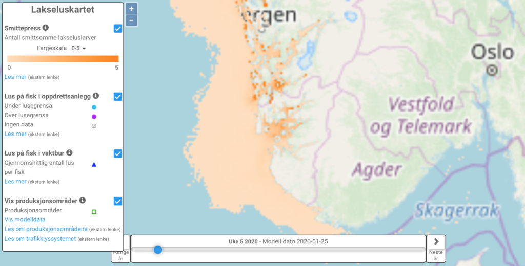 Ved hjelp av en modell som beskriver strømmene i havet, kan forskerne beregne spredningen av lusearver langs norskekysten.